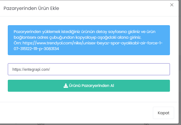 - Açılan ekranda pazaryerinden yüklemek istediğiniz ürünün detay sayfasına gidiniz ve ürün bağlantısını adres çubuğundan kopyalayıp ürün bağlantı alanına yapıştırınız.