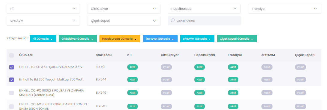Pazaryeri entegrasyon durumları linkine tıkladığınızda gelen liste ekranında güncellemek istediğiniz ürünleri seçerek açılan menüde pazaryeri durumlarını kolayca güncelleyebilirsiniz.